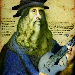 - Dall-E (openai.com/dall-e-2/) luo kuvia käyttäjän antaman tekstin perusteella. Oheisen kuvan syötteenä on ”Leonardo da Vinci soittaa sähkökitaraa”. Rajatun toiminnallisuuden sovellusta pääsee maksutta käyttämään mm. täällä huggingface.co/spaces/dalle-mini/dalle-mini.